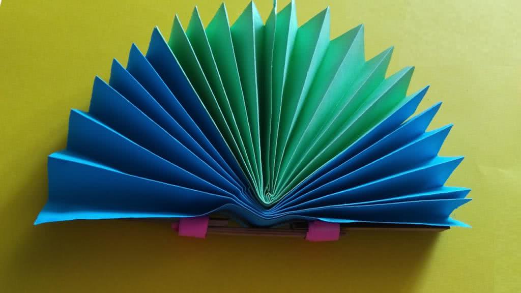 Синяя бумага укладывается снизу, а зеленая сначала склеивается боковыми поверхностями между собой, как в первом варианте. Потом крайние полоски зеленого сектора присоединяются к таким же нижней детали. В итоге получается гофрированный полукруг.