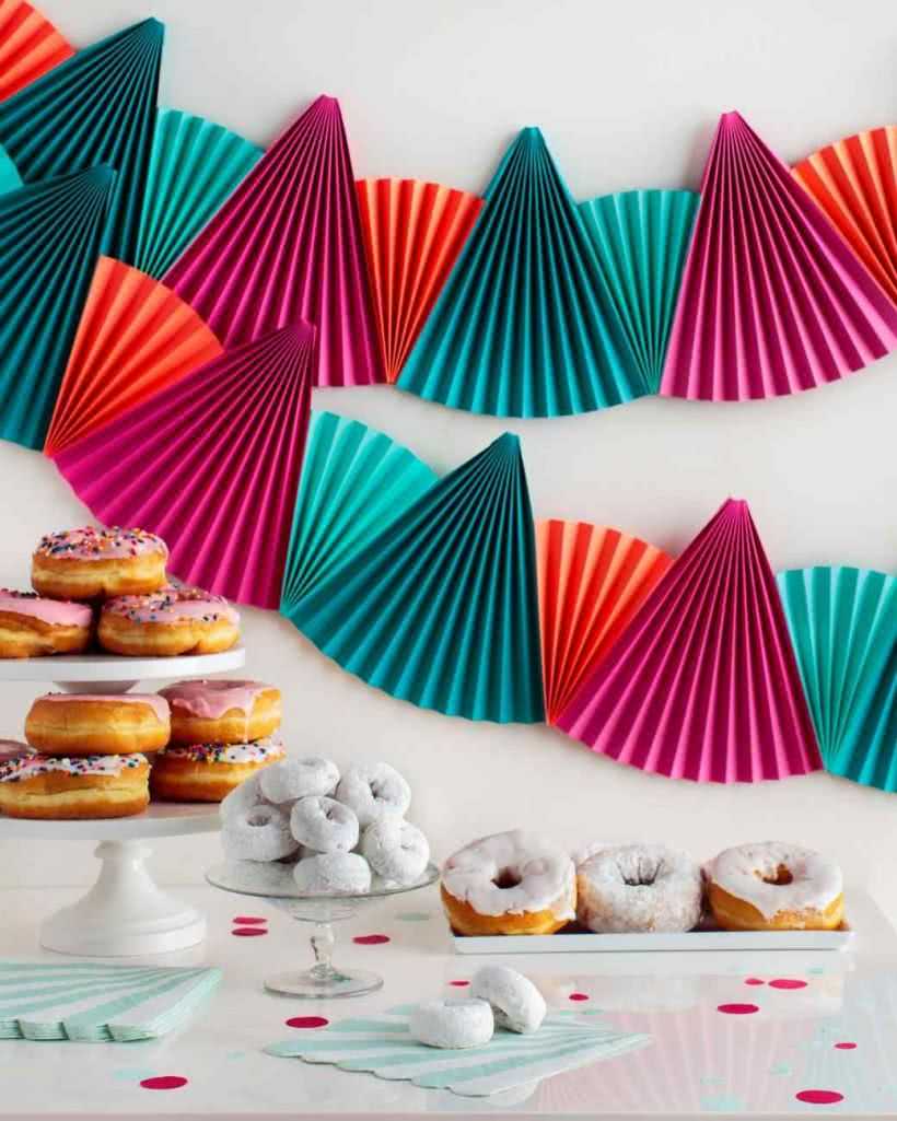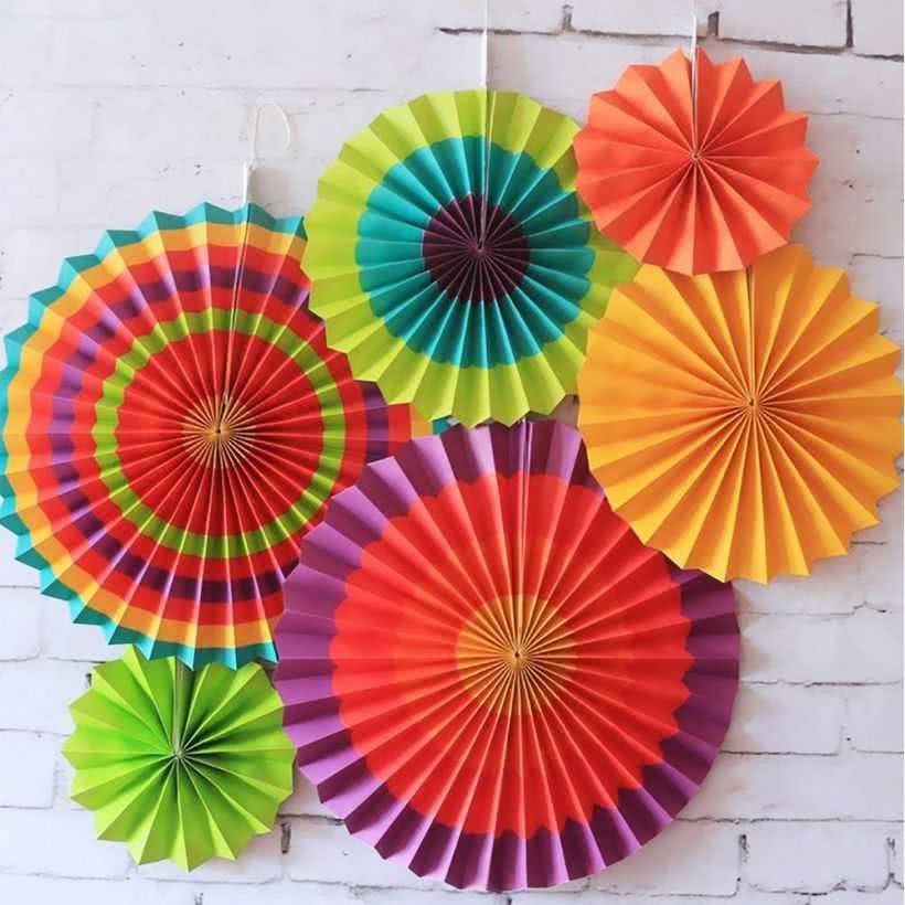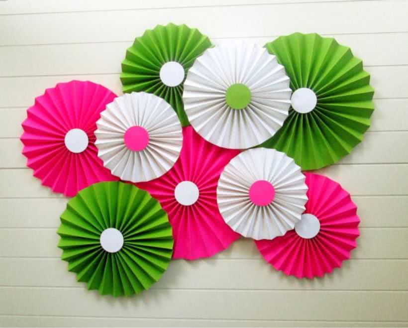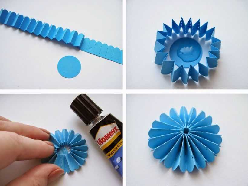 Как сделать гофрированные круги из бумаги, вы уже поняли, но есть несколько вариантов соединения их в единое целое. На фотографии ниже хорошо видно, что склеивание бумаги происходит немного иначе. Первый лист, собранный «гармошкой», раскладывается на поверхности стола боковой частью вверх. Затем выполняется работа по сгибу полосок на втором листе. На фотографии они выделены разными цветами.