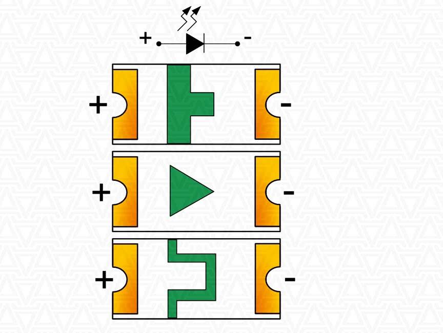 Светодиоды для поверхностного монтажа активно используются в прожекторах, лентах, светильниках. Определить контакты в них можно также зрительно. Они имеют ключ (скос), который указывает на отрицательный электрод.