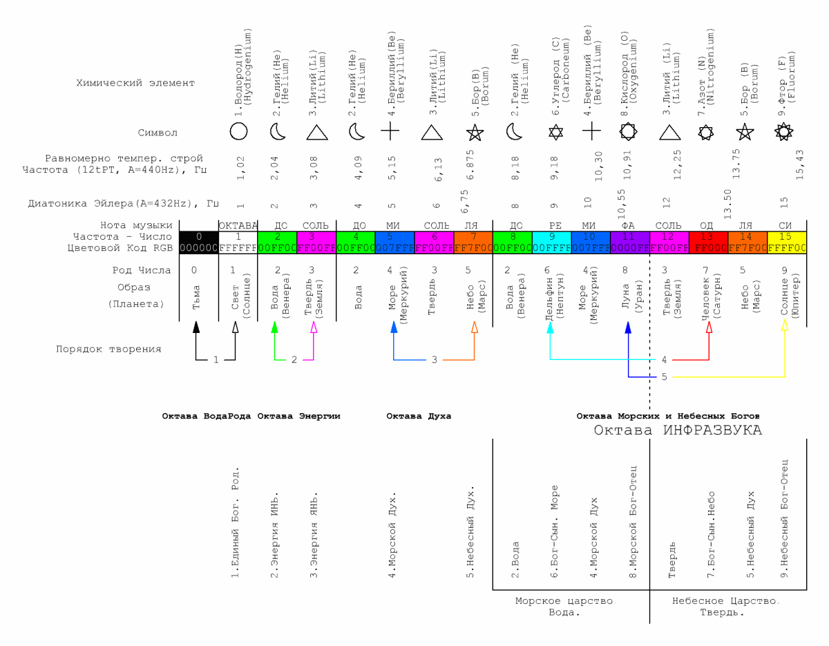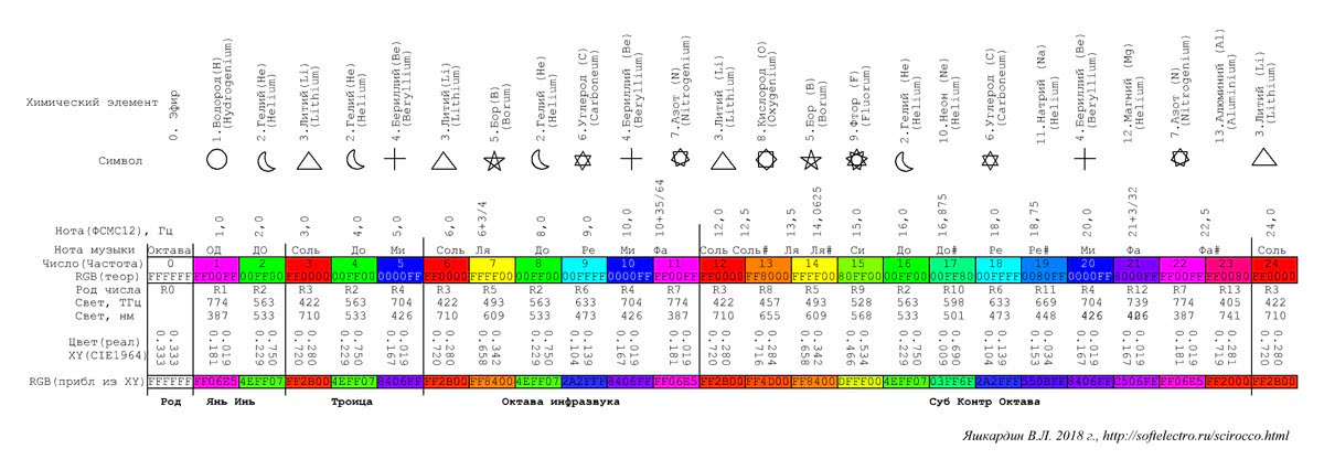 Здесь хорошо видно как связаны цвета, свет, ноты, числа, химические элементы, рода чисел, символы и др.