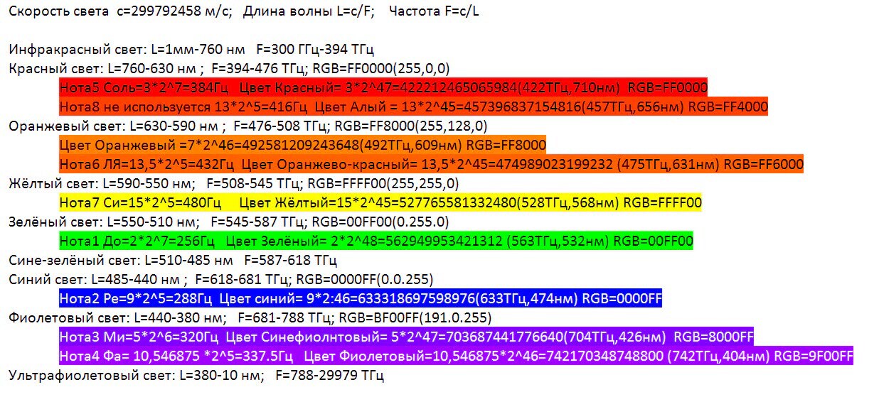 Соотношение нот и цветов заданы цветом Радугой, так как свет есть колебание материи с частотой от 394 до 789 ТГц .