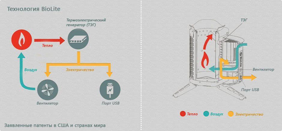 К примеру, печь BioLite CampStove способна работать на любом древесном топливе: веточки, щепки, шишки. Она выдает до 5 Вт мощности, оборудована USB. Чтобы вскипятить литр воды, достаточно совсем немного древесины, а займет это буквально 5 минут. Цена BioLite CampStove 9 600 рублей.
