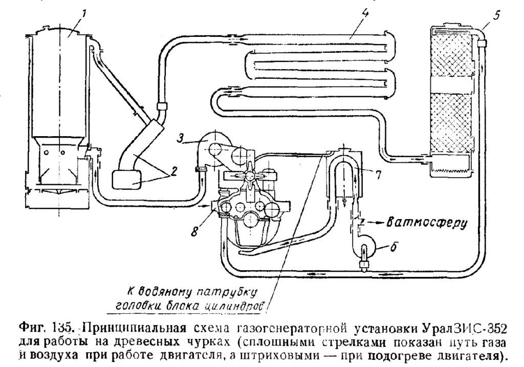 На изображении внизу приведена схема самой совершенной автомобильной газогенераторной установки, которой оснащались серийные автомобили (речь идет о грузовике «УралЗИС-352″, выпускавшимся в 1950-х гг.). Именно на ее конструкцию лучше всего ориентироваться при сборке своего газогенератора: