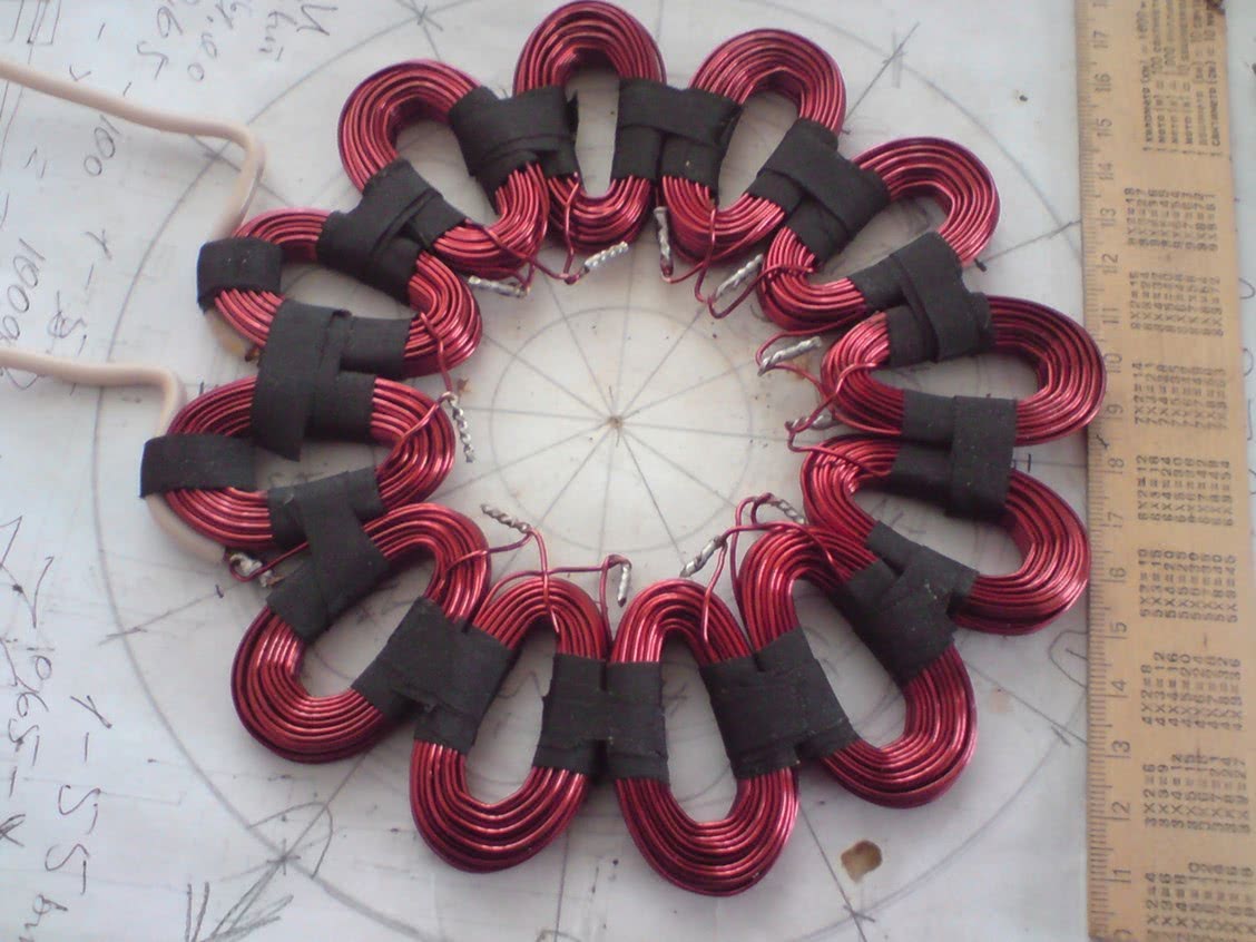 После завершения сборки ротора следует подготовить детали для неподвижной части конструкции – статора. Он состоит из катушек из медного провода. Его сечение должно быть большого диаметра, чтобы снизить сопротивление. Как правило, намотку таких катушек осуществляют на глаз. Чтобы зарядить батарею в 12В при 120-150 оборотах в минуту, нужно около полутора тысяч витков (суммарно для всех катушек). Наматывается провод на готовых частях будущей конструкции или самодельных макетах.
