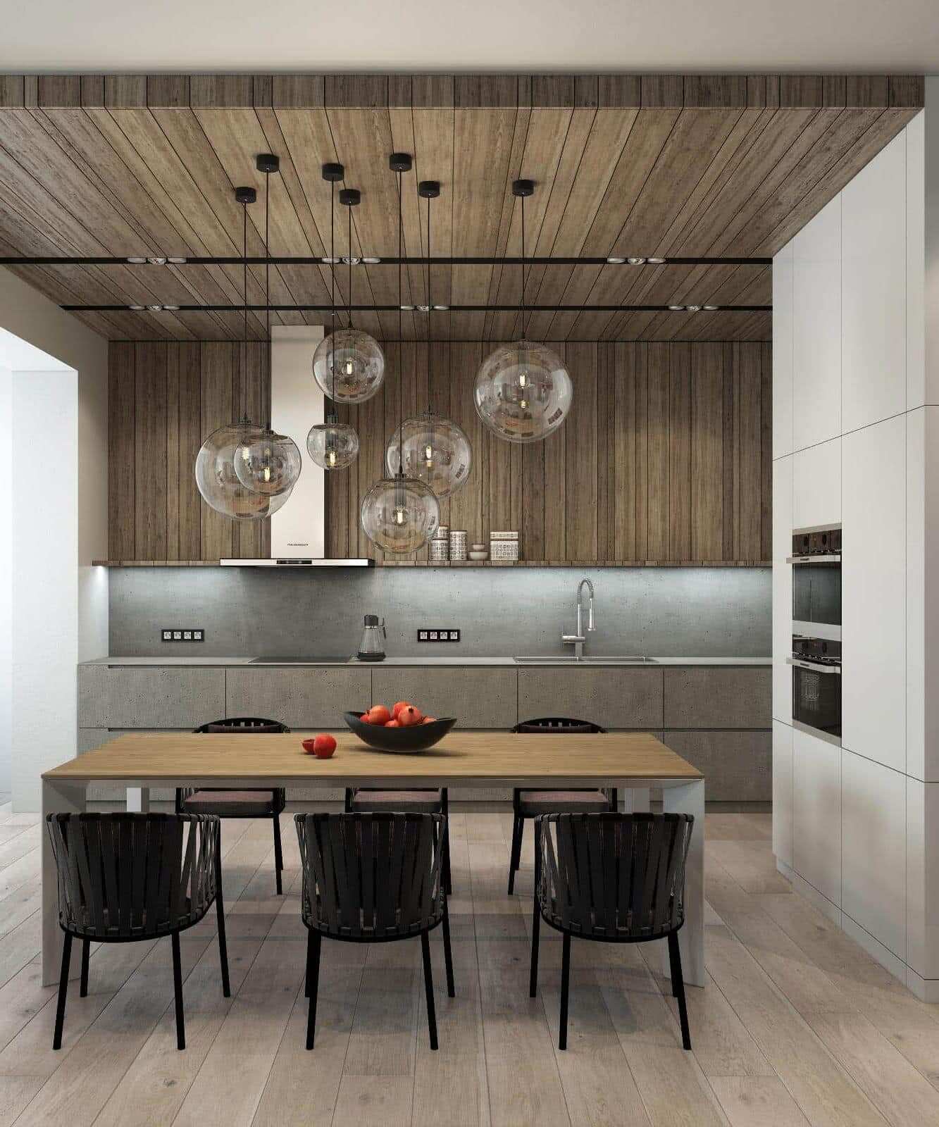 Специфика кухонного интерьера требует продуманного подхода к выбору оформления потолка. Материалы должны быть влагостойкими, не испытывать деформации при температурных колебаниях, хорошо мыться. Можно выделить несколько популярных направлений в плане дизайна модных потолков 2021.