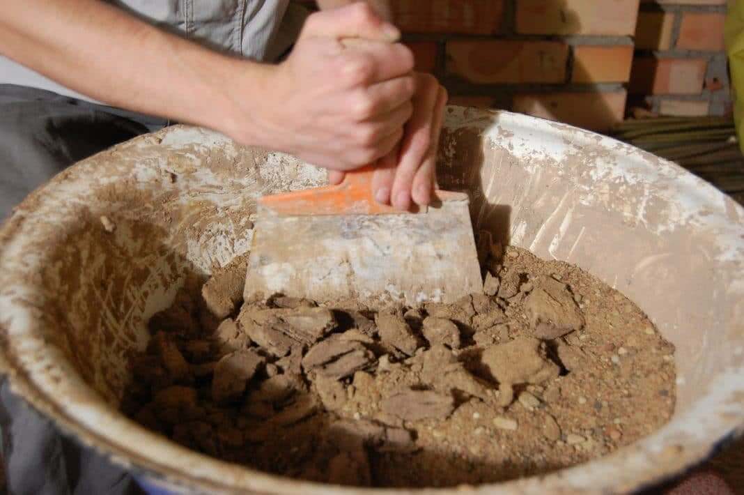 - Готовность раствора определяют при перемешивании его палкой. Если на ней остается много глины, тогда в смесь нужно добавить песок. Раствор готов, когда к палке прилипают небольшие сгустки.