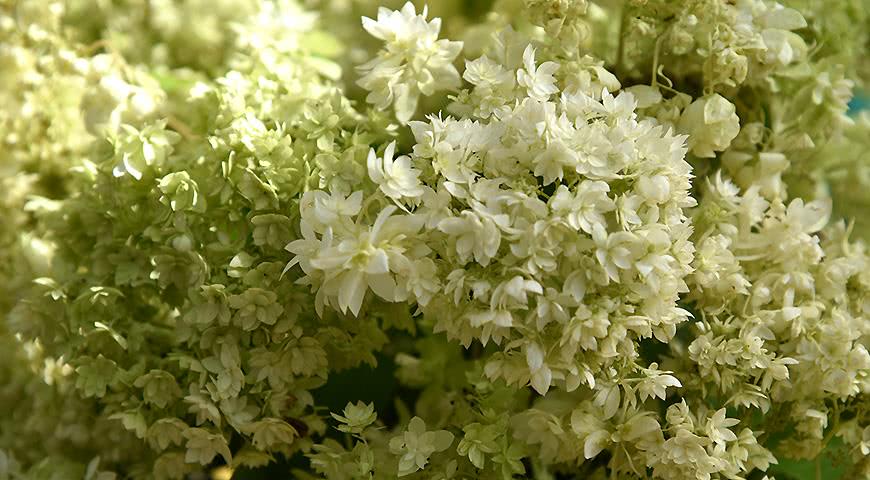 Соцветия зонтиковидные, состоят из стерильных махровых цветков, вначале светло-зеленоватых, в период полного роспуска – белых.