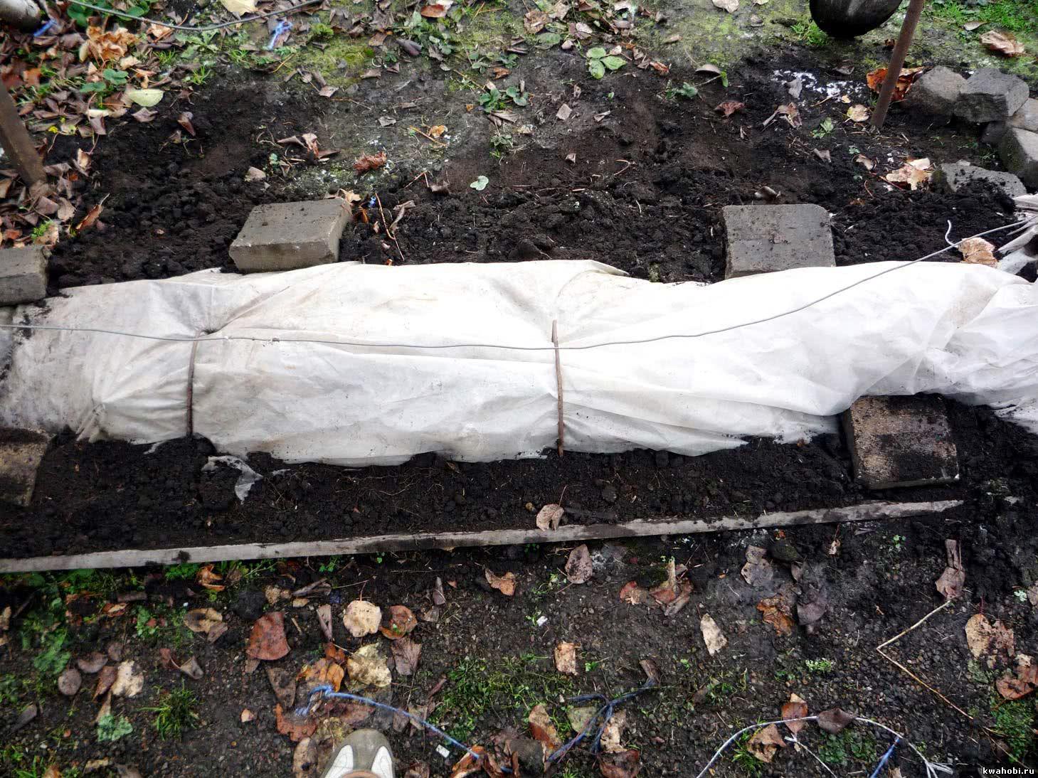 Укрывную ткань накладывают сверху и прижимают по краям камнями, чтобы зимой не сдуло ветром.