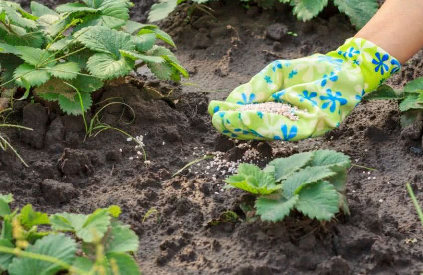Активное развитие кустов и плодов клубнике обеспечивают минеральные удобрения. Лучше всего использовать препараты с большим содержанием таких элементов, как калий, фосфор, азот. В качестве органических удобрений применяются навозно-торфяной компост или перегной. Удобрить почву можно так: внести в перекопанную землю 10 г хлористого калия из расчёта на каждый 1 м², с добавлением 30 г суперфосфата.