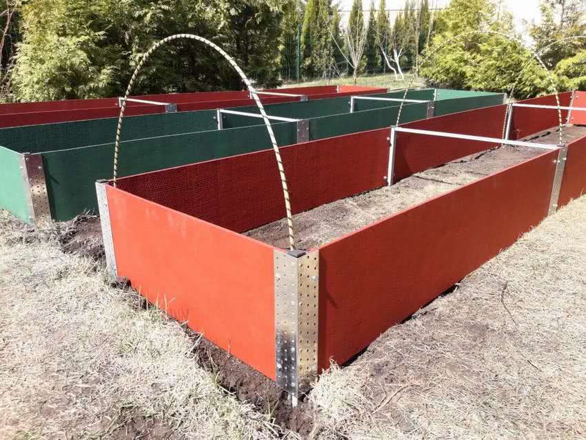 Интересным решением, будет поставить грядки из досок в ряд и покрасить их в один цвет.