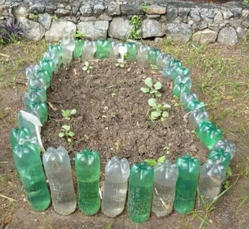 Проявив немного фантазии, можно сделать грядки необычной формы. Сделать такие грядки несложно, просто отрежьте верхнюю часть бутылки, засыпьте песком и готово.