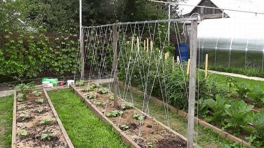 Вертикальное сооружение из дерева для выращивания огурцов.