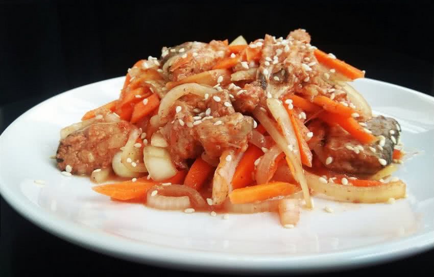 - После того, как масло остынет, вводим к рыбе овощи, а в конце соевый соус 8 ст. ложек, он достаточно соленый, поэтому рыбный салат можно не солить.
