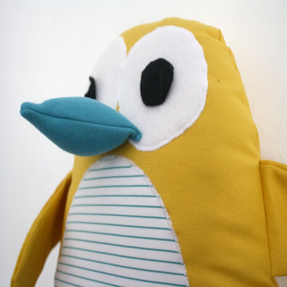 Приложите глазки к туловищу и зафиксируйте их булавками. Пришейте вручную или при помощи швейной машинки.