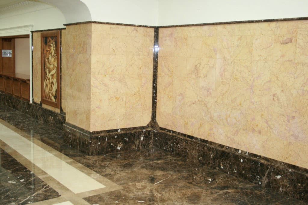 Выполнить облицовку под мрамор своими руками можно, используя керамическую плитку. Она более долговечна, а отделать с ее помощью можно не только стены, но и полы.