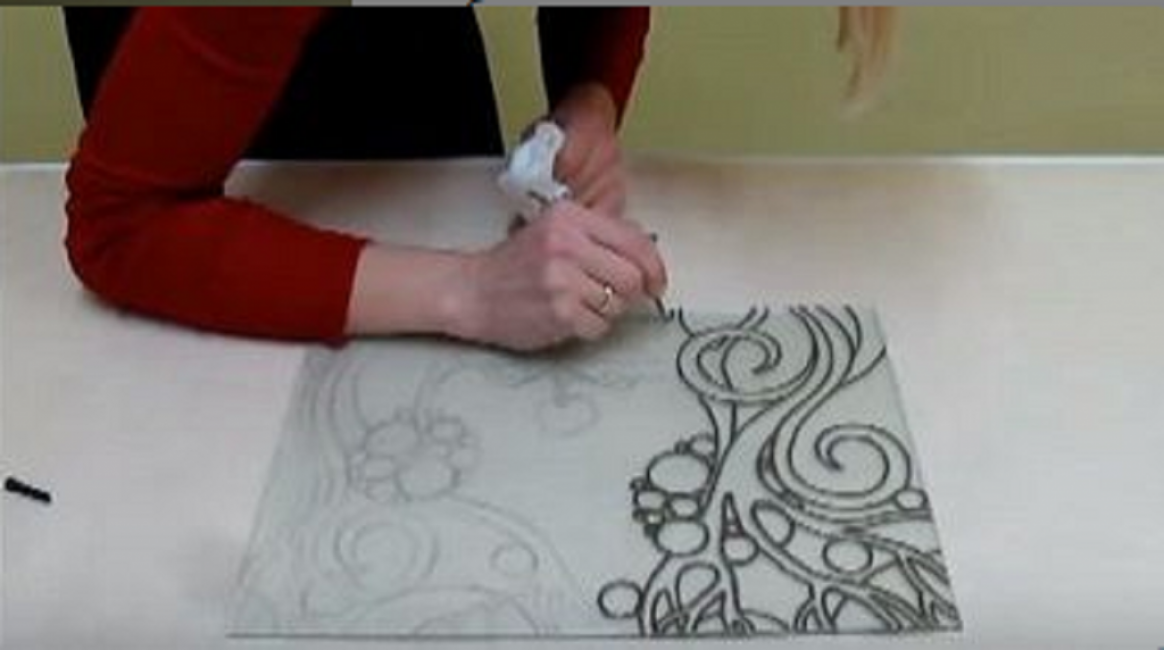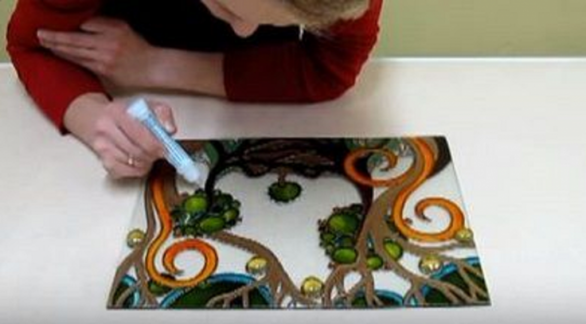 — Контуры витража, изготавливаемого по технологии заливки, должны быть выпуклыми и замкнутыми, чтобы краска не разливалась. Для этого используют специальную контурную краску с удобным дозатором или смешивают с клеем тушь, добавляя для металлического цвета серебряную или свинцовую пудру.