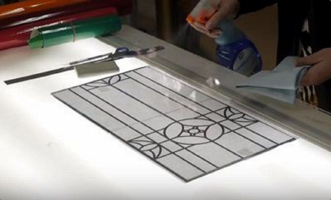 Пленочный витраж – это имитация классического витража. На основу из прозрачного, матового или молочного стекла наносят рисунок, между фрагментами которого делают бордюры. Вместо смальт используют самоклеящуюся пленку. Сделать такой витраж под силу даже новичку, нужно лишь немного аккуратности и усидчивости. Секрет успеха – предварительная обработка стекла спиртом для обезжиривания поверхности. Можно вместо спирта использовать 1 чайную ложку средства для мытья посуды, разведенную в стакане воды. После такой обработки обязательно стекло следует промыть дистиллированной водой.