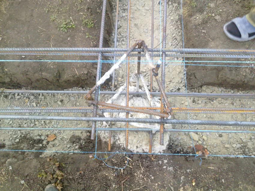 Вертикальная арматура раскладывается вдоль всех траншей, из расчета по одному пруту на каждый угол. Если фундамент более 40 см в высоте, то рекомендуется укрепиться в центральной части лены еще двумя прутами. Далее, вдоль осей и по горизонтали, с шагом в 40 см устанавливаются «П» – образные скрутки из арматуры. Вертикальная и горизонтальная арматура вяжется проволокой меду собой и со стенками опалубки.