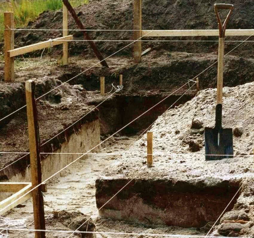 Разметка будущего сооружения на земле с помощью кольев и веревки.