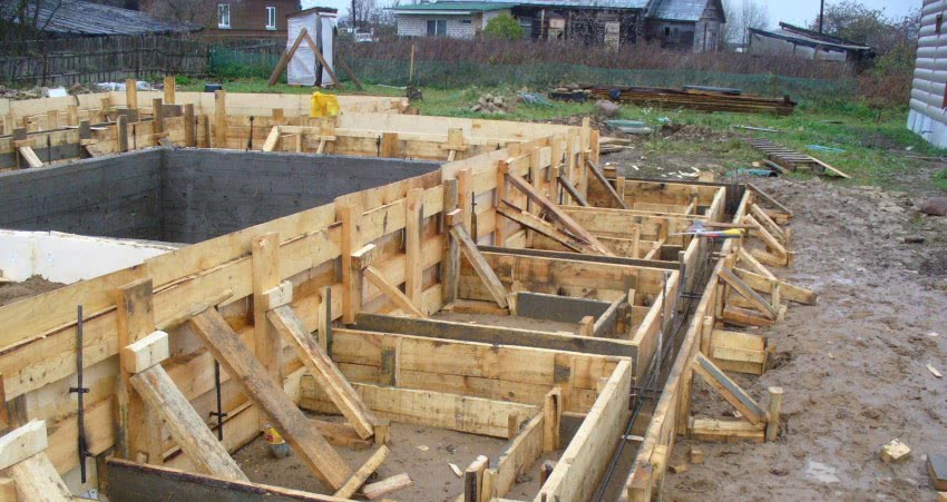 Во время устройства формы для основания ленточного типа выполняют очень большой объем работы. Ее форма повторяет контуры здания и каждой несущей стены. При этом материал устанавливают с обеих сторон ленты. Если дом большой и имеет много внутренних перегородок, траты на материал для опалубочной конструкции увеличиваются. Особенно сильно они возрастают, если основание здания заложено глубоко.
