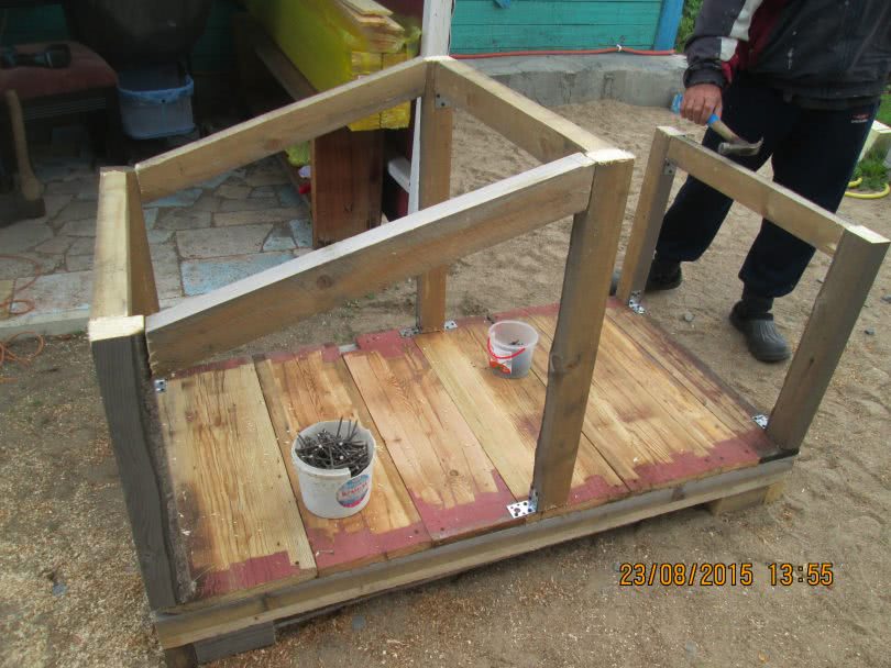 - Из брусков собирается основание, дальше вырезаются днище и пол будки.