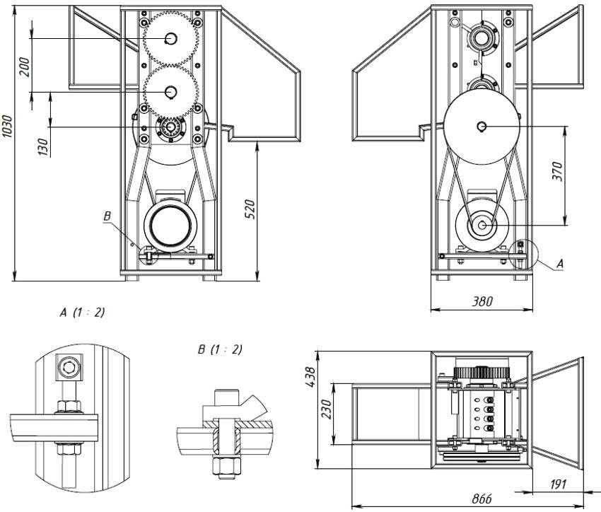 Теперь на валы надеваются шестеренки, для синхронизации движения, и вся конструкция устанавливается на раму и закрепляется при помощи болтов. Затем устанавливается двигатель, который соединяется с валом ременной передачей или цепью. Двигатель лучше брать большой мощности, но с малым числом оборотов. В конце устанавливается и закрепляется приемный бункер. Затем на все вращающиеся части шредера надевается защитный кожух во избежание попадания в измельчитель посторонних предметов.