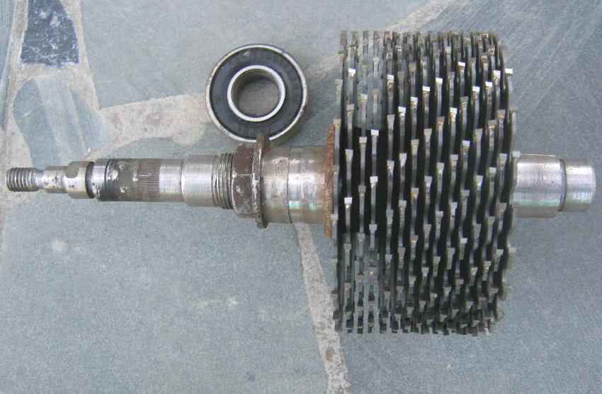 На нанизанную дисками шпильку устанавливается шкив, который можно взять от помпы или от генератора ВАЗ. Для вращения оси потребуются два подшипника с внутренним d=20мм