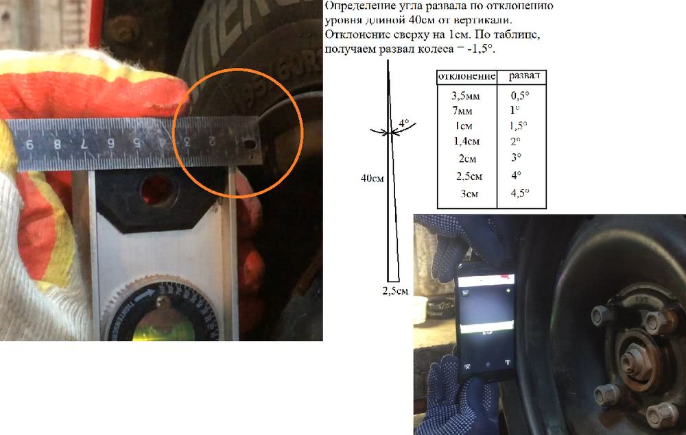 Угол развала также можно измерить с помощью пузырькового уровня или телефона с установленной программой для измерения углов.