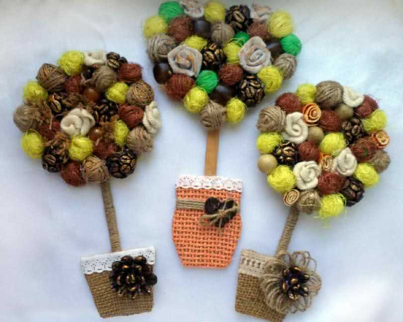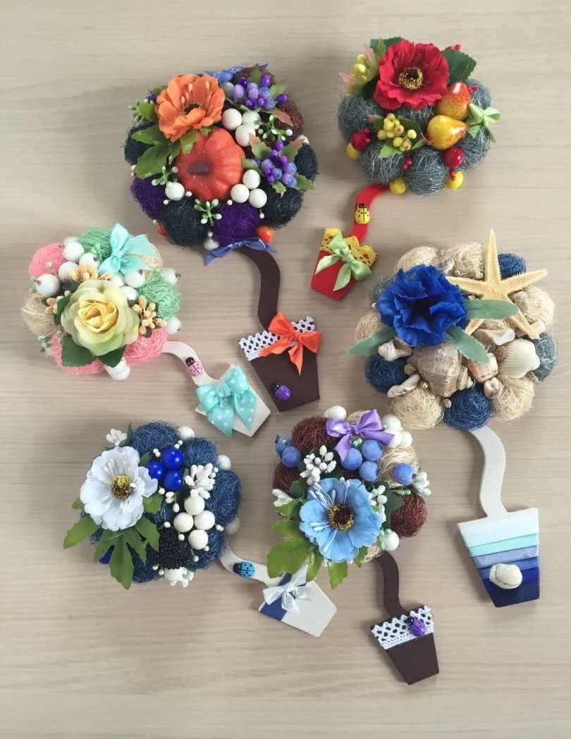 - Вариант 2. Вместо корзинки из картона вырезают ствол дерева, красят акриловой краской и покрывают лаком. Крону дерева украшают цветами и листочками. Когда клей высохнет, на поделку наклеивают полоску магнита. Если букет получился тяжелым, берут ферритовый или неодимовый магнит.
