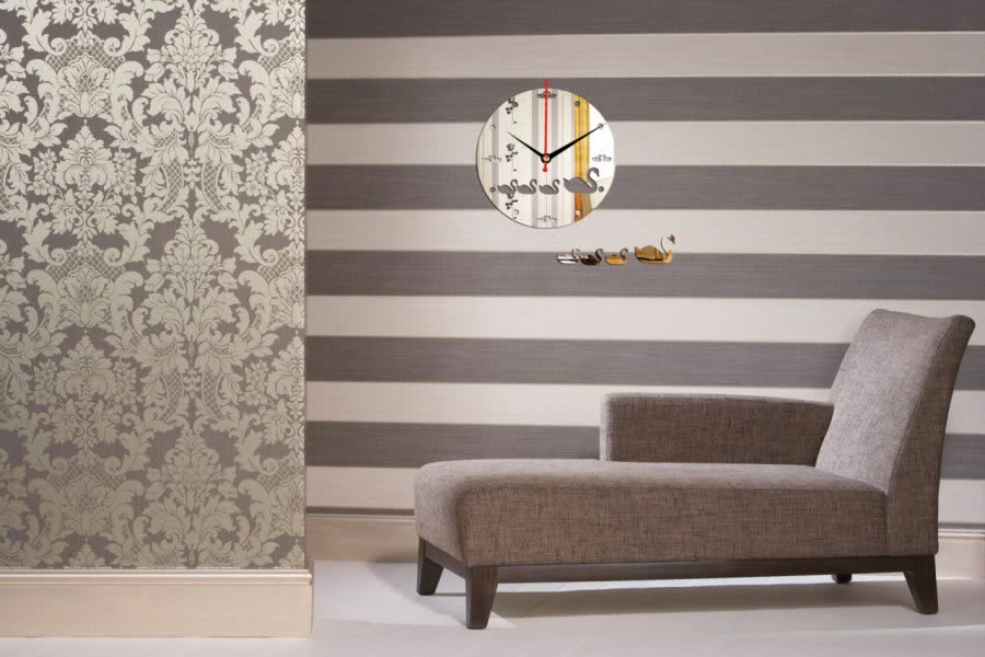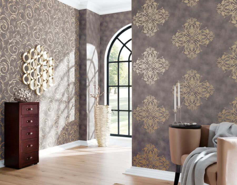 бледные рисунки на фактурных обоях; полосы; монохромные цвета — светлые, кремовые и бледные цвета; имитация декоративной штукатурки; витиеватые линии; орнаменты, стилизованные под дворцовую роспись.