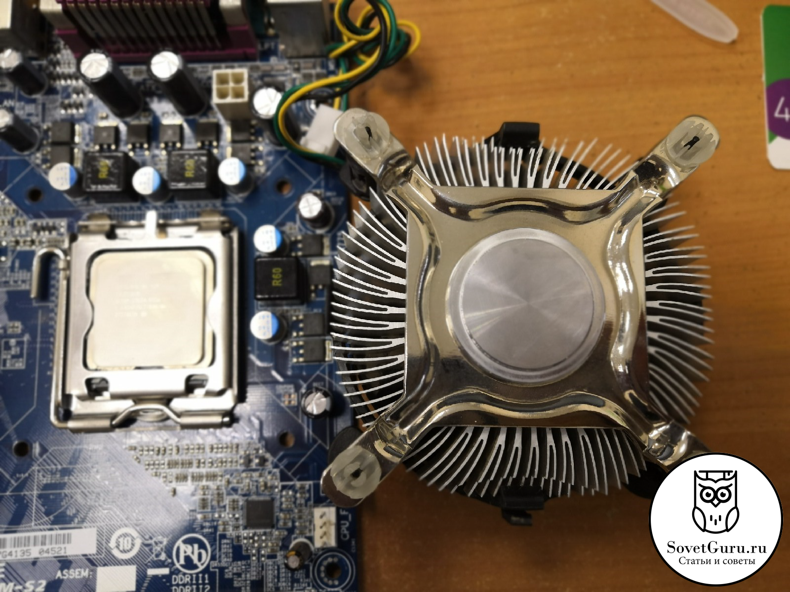 После того как вы размазали термопасту по поверхности процессора — вам нужно поместить радиатор охлаждения на место. Попробуйте установить его правильно с первого раза, избегайте многократного подъема и отрывания радиатора от пасты, это приведет к деформации клея и уменьшит эффект отвода тепла.
