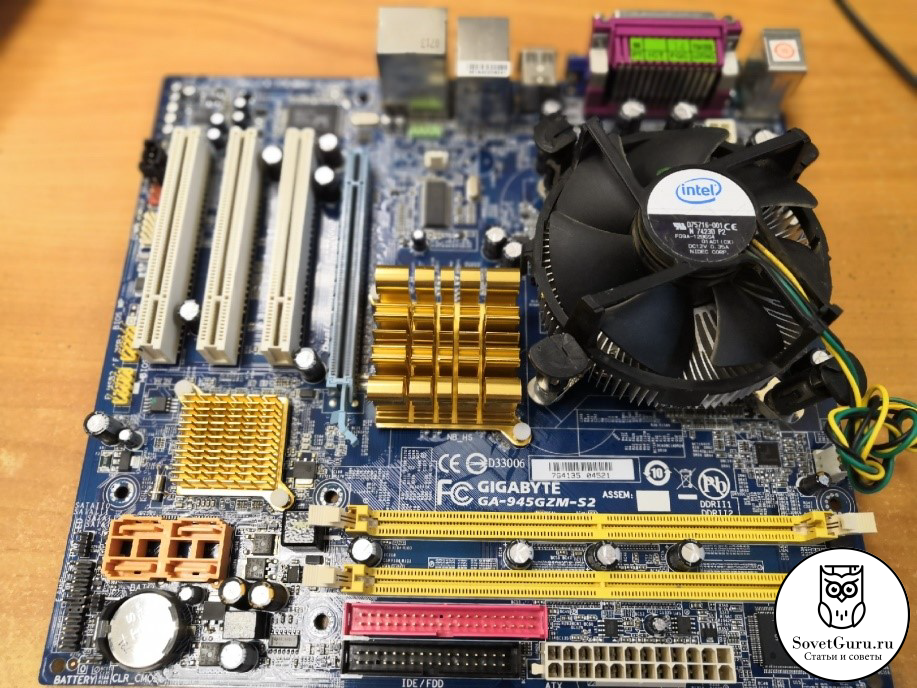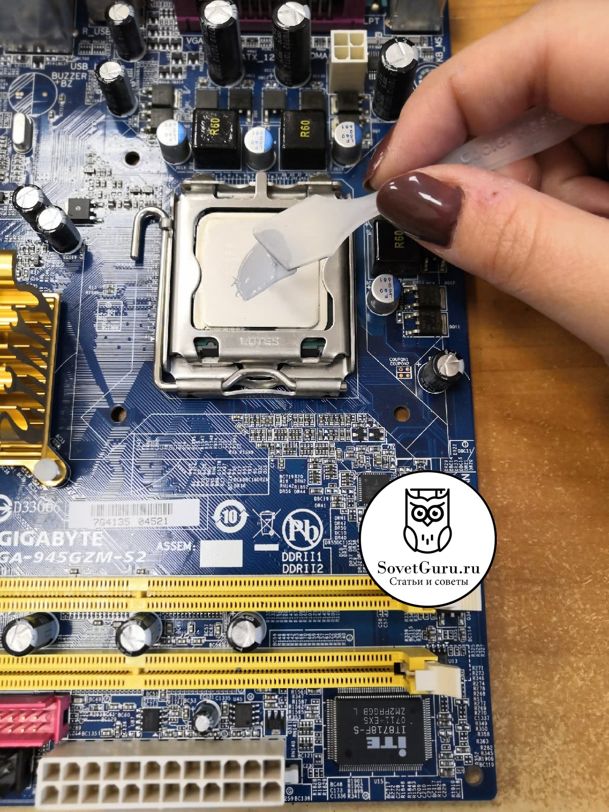 Когда термопаста будет размазана по всей поверхности процессора, надевайте на него кулер, при этом непосредственно на радиатор наносить теплопроводную смесь не стоит.