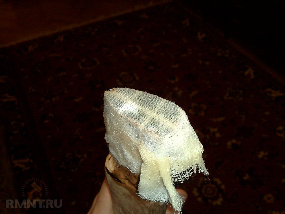 Бывает так, что полностью избавиться от просветов не удается. В этом случае можно использовать обычную марлю, пропитанную эпоксидкой. Для этого верхнюю часть топорища до насаживания топора обматывают пропитанной марлей. Эпоксидная смола позволяет устранить любой просвет либо трещину, образуя тем самым надежную фиксацию топорища.