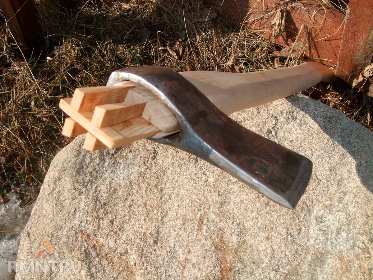 Забивать клинья можно резиновым или деревянным молотком, выступающие части отпилить. Главная опасность на этом этапе — расколоть топорище, слишком сильно загоняя клинья.
