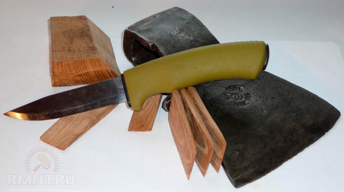 Важно! Клинья нужно сделать из более твёрдого дерева, чем топорище. Можно взять лиственницу, дуб, бук (если топорище из берёзы). Один клин будет широким, четыре — узкими