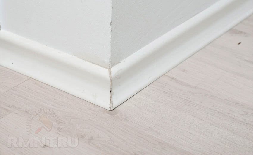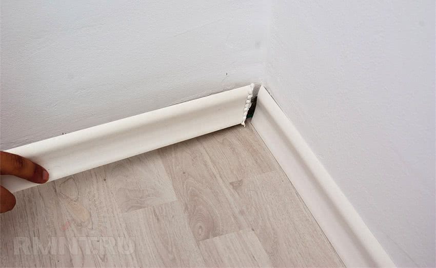 - Прижмите плинтус к левой стороне от угла таким образом, чтобы планка выступала за угол как минимум на свою ширину;
