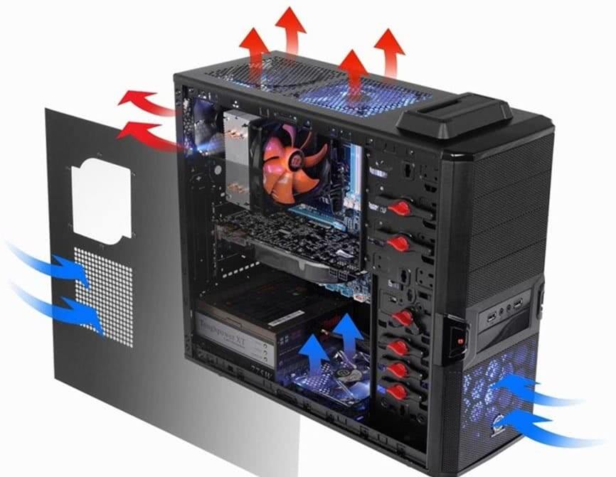 При организации охлаждения компьютерного корпуса нельзя забывать о вентиляторах на выдув. В корпусе должен быть хотя бы один вентилятор, который будет работать на выдув и выбрасывать нагретый воздух наружу.