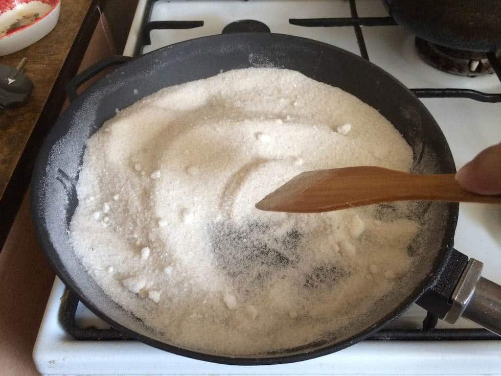 - Вылейте раствор с содой в сковороду, поставьте на плиту, дождитесь закипания.