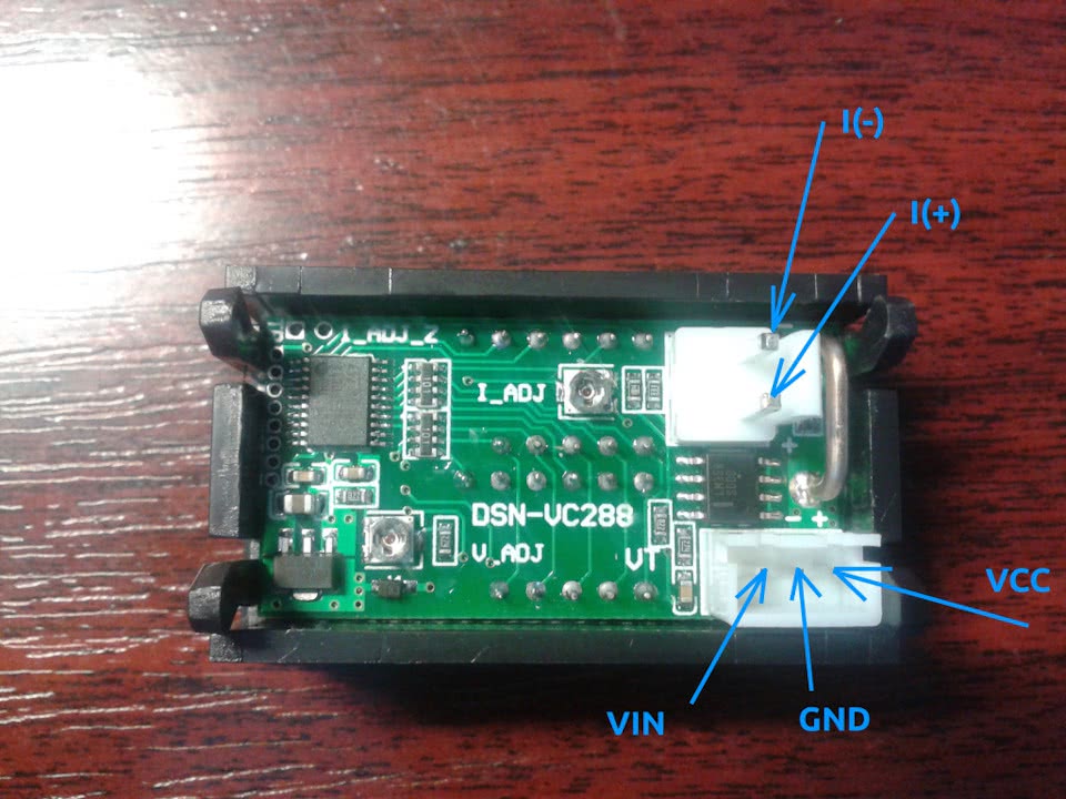 Подключается прибор просто: трех контактный разъем — это подача питания и подача измеряемого напряжения. Питание в диапазоне от 5 до 36 Вольт, а измеряемое напряжение собственно это то, которое будем замерять. Второй двух контактный разъем — предназначен для измерения тока включается в разрыв измеряемой цепи. Также на плате находятся два переменных резистора с обозначениями I_ADJ и V_ADJ. Это калибровка тока и напряжения соответственно.