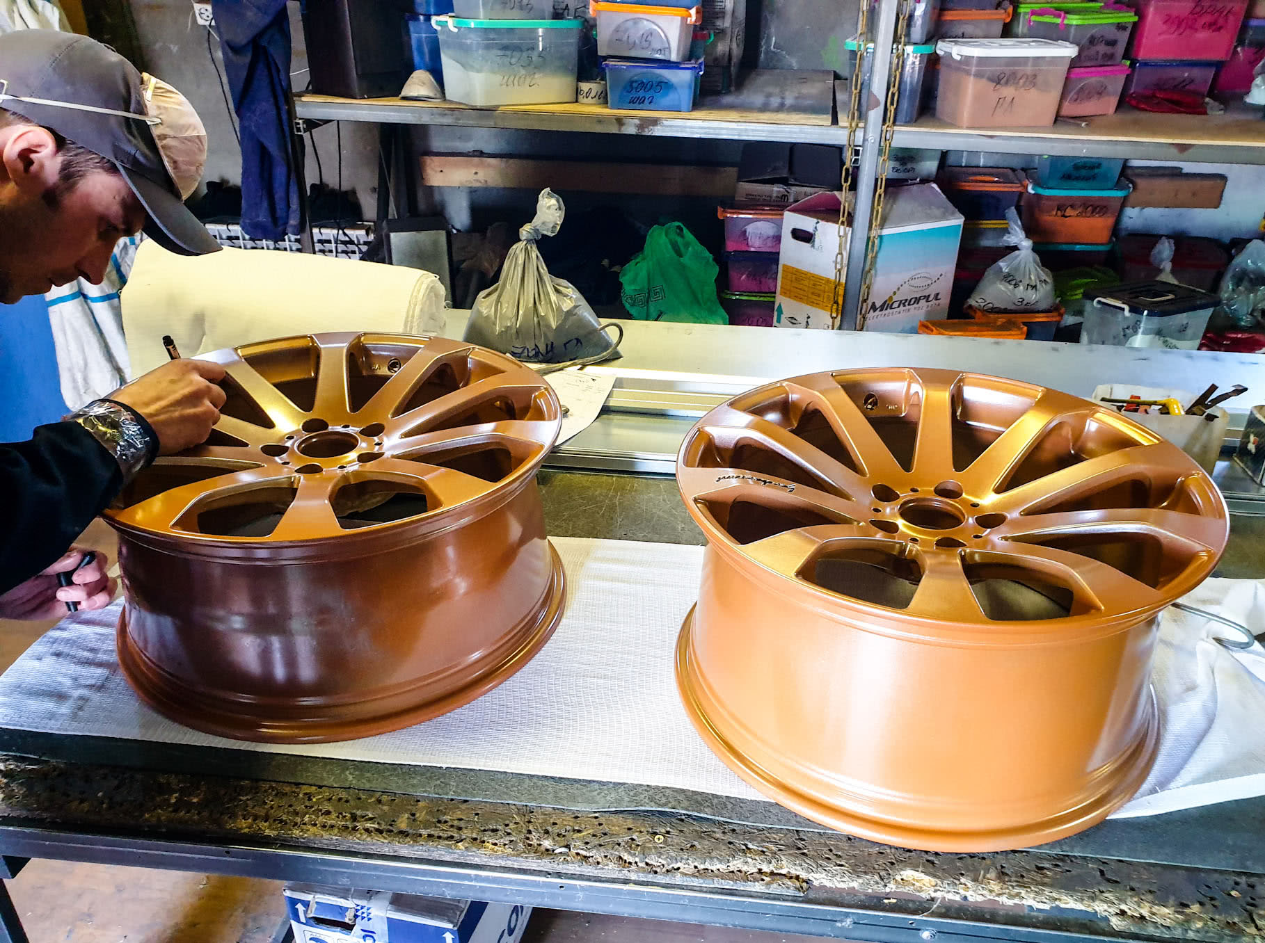 Для покраски литых дисков рекомендуется использовать акриловые эмали и жидкую резину, порошковая покраска применима только для низкотемпературных составов, нагрев которых для полимеризации проводится при температуре 200-250 градусов.