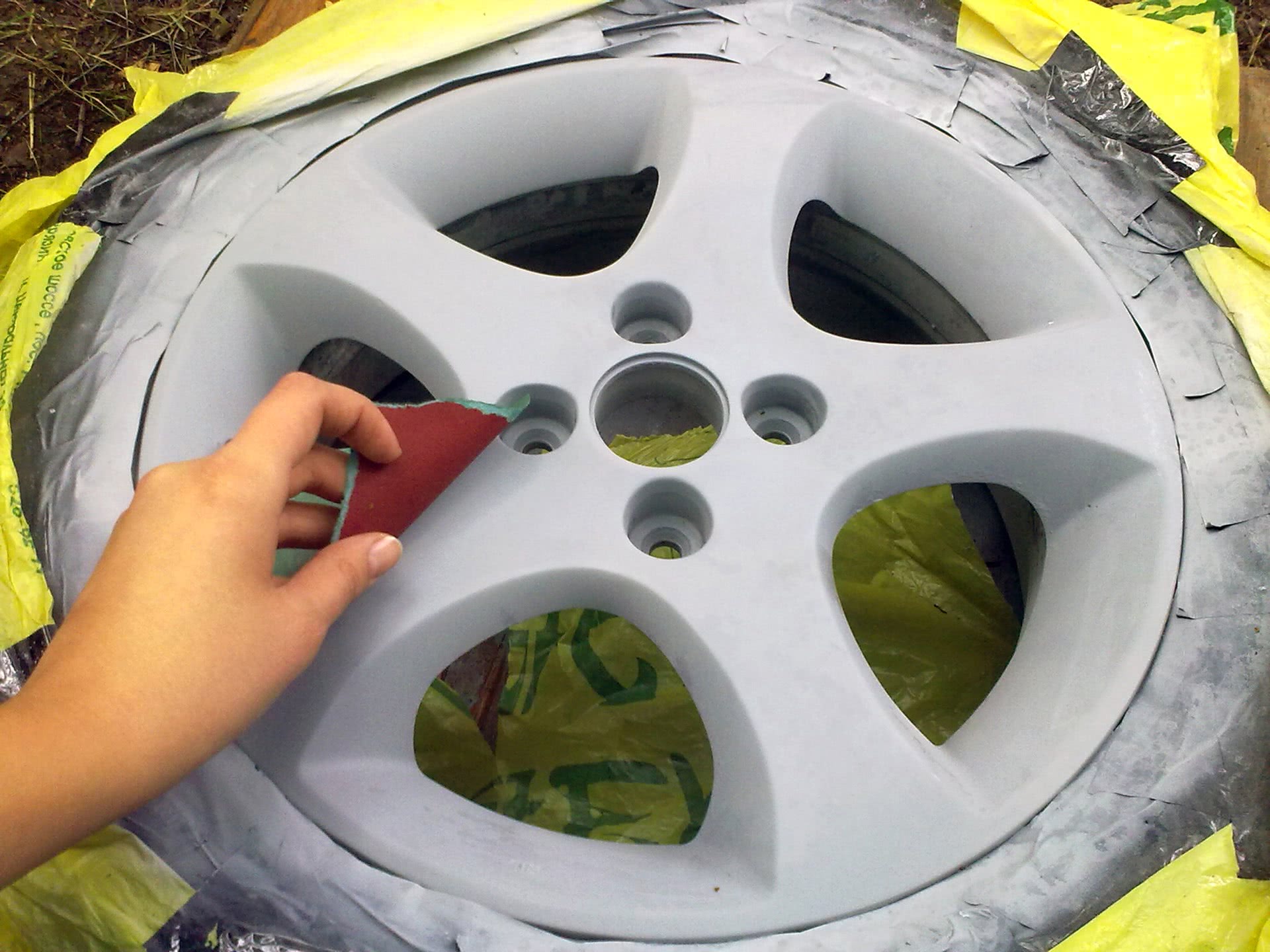 Мойка автомобиля не уберет всю грязь с дисков, поэтому дополнительно нужно очистить поверхность щеткой. Необходимо убрать старую краску. С этим успешно справится наждачка. Пыль убирают сжатым воздухом либо обычной сухой тряпкой. Мелкие дефекты, такие как неровности и мелкие царапины, не нуждаются в шпаклевке. Их без труда можно убрать грунтовкой. Обезжиривание нужно для того, чтобы нанесенная краска не отслаивалась. Поэтому этот процесс пропускать тоже нельзя.