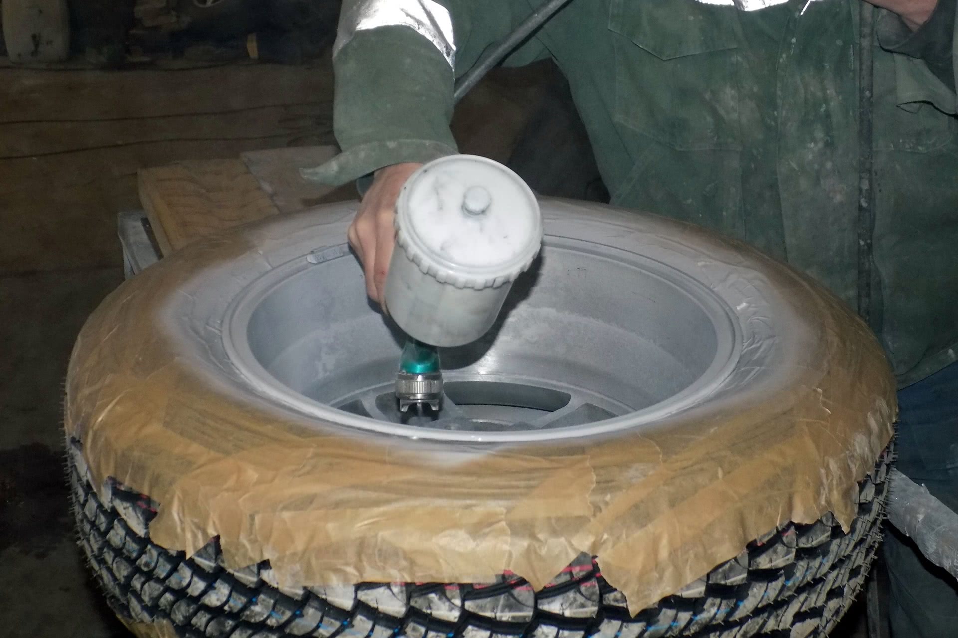 Если покраска диска выполняется непосредственно на автомобиле, то внешние обода колеса надо укрыть бумажным слоем и замотать малярным скотчем. Этот процесс избавит от лишних хлопот по отмыванию покрышек. На завершающем этапе используется растворитель в качестве обезжиривания для последующего окрашивания.