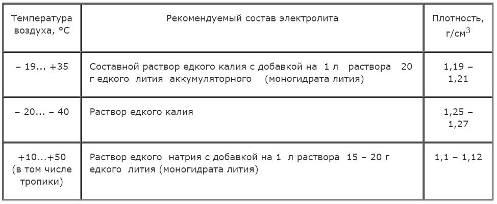 Таблица 2. Состав и плотность электролита для кадмиево- и железоникелевых и аккумуляторов.