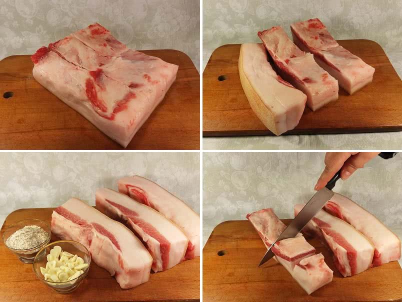 Свиное сало разрезать на куски. Оптимально сделать куски размером около 6 см в ширину и 7-8 см в длину.