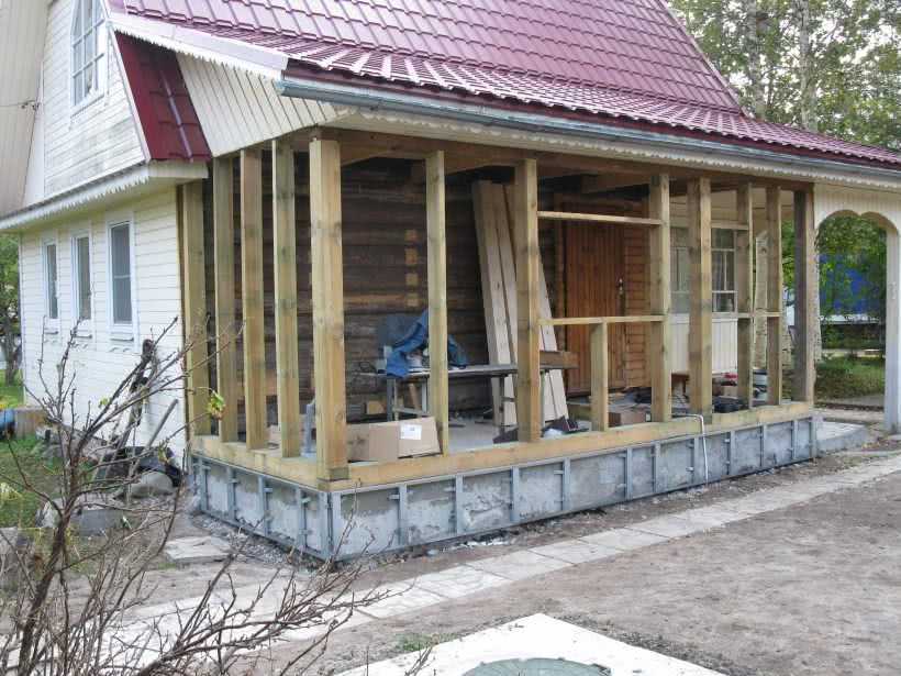 осуществляется в последнюю очередь, хотя именно с его закладки начинается строительство веранды. Причина подобного подхода заключается в необходимости знать полный вес пристройки, учитывая также снежную, ветровую и эксплуатационную нагрузку на неё. Тем не менее, часто под веранды устанавливаются столбчатые, свайные или ленточные фундаменты:
