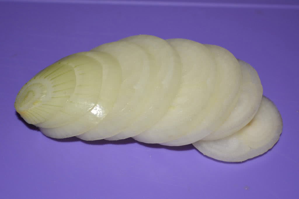 Теперь займемся луком. Возьмем одну крупную сочную луковицу и нарежем ее колесиками.