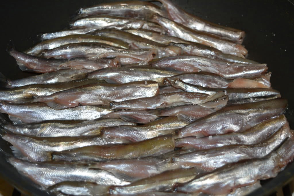 Сковороду смажем растительным маслом и разложим на ней вычищенную мойву плотным слоем. Если рыбка не влазит, то можно уложить ее в 2 слоя.