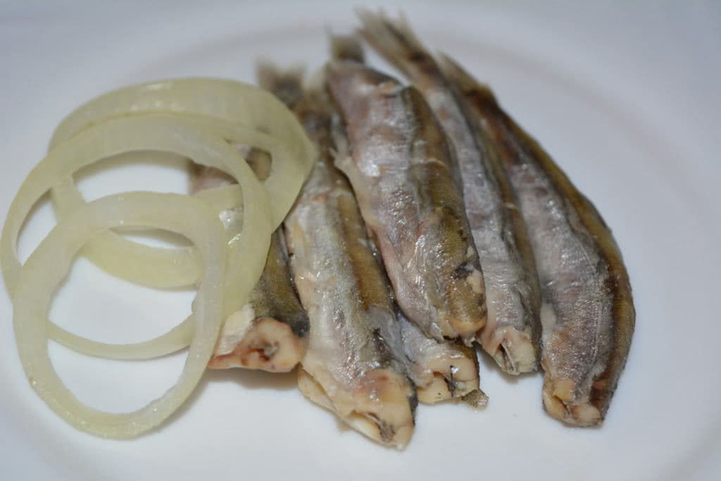 - Подготовленную и приправленную по вкусу мойву располагают между двумя слоями нарезанного полукольцами или кольцами лука и щедро смазывают поверхность яства сметаной.