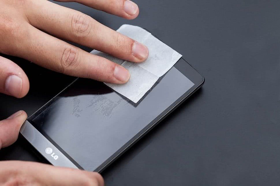 Чтобы защитное покрытие надежно приклеилось, поверхность экрана смартфона обезжиривают