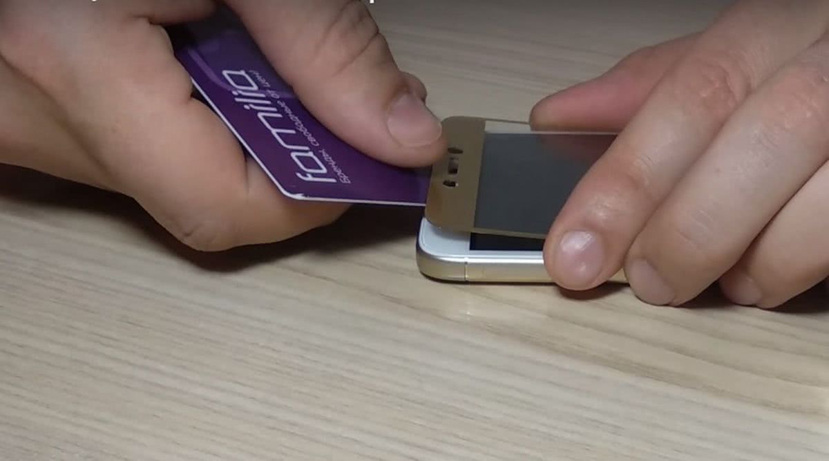 - Установить стеклянную защиту ровно по основным вырезам, ориентируясь на расстояния от краев передней панели. Ее следует аккуратно приложить к дисплею, прижать с одного края, а затем пластиковой картой с усилием провести по направлению к другому. Это позволит удалить попавший под стекло воздух.